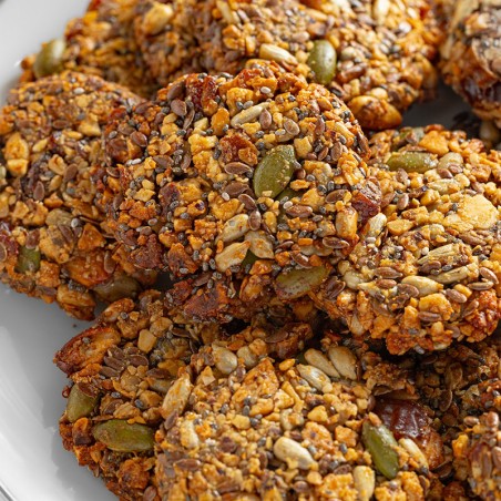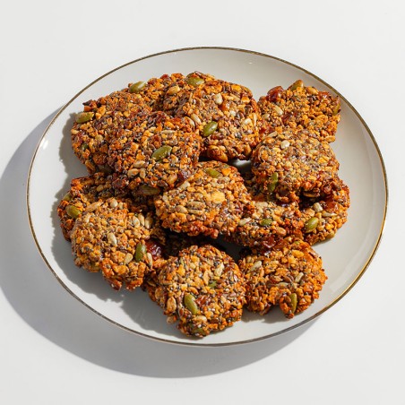 Ce biscuit sans gluten marie la douceur naturelle du miel et des dattes à un mélange généreux de noisettes, d’amandes et de graines sélectionnées : lin, courge, tournesol et chia.