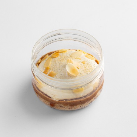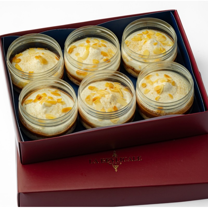 Ce dessert danse sur les notes délicates de la cardamome, où chaque bouchée raconte une histoire d'harmonie et de douceur (orientale). Sur une couche de biscuit au beurre, parsemée d'amandes rouges torréfiées, repose un confit d'amandes pralinées, fondant et parfumé. La mousse, infusée de cardamome, enveloppe le palais d'une caresse subtile et les éclats de cardamome moulue viennent sublimer ce dessert d’épices et de caractère