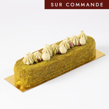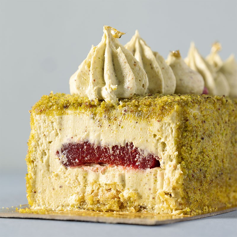 Une dacquoise à la pistache, surmontée d'un croustillant chocolat blanc et pistache, avec un cœur crémeux 100% pistache et une insert de framboise. Le tout est délicatement couronné d’une ganache légère au chocolat blanc et pistache, pour un contraste parfait entre douceur et fraîcheur.