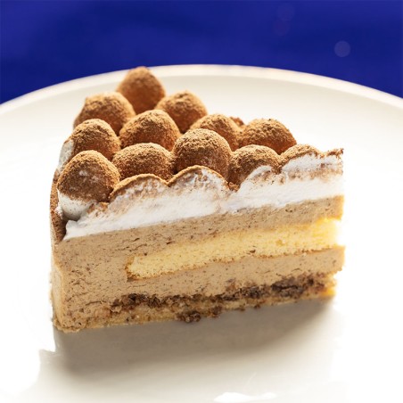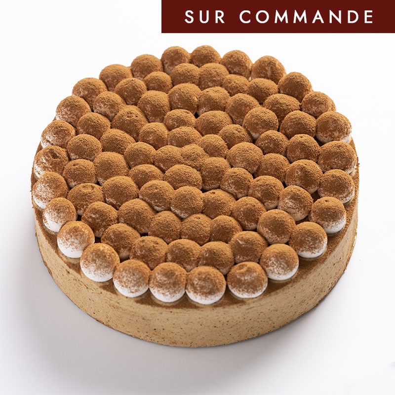 Une dacquoise moelleuse à la noisette, surmontée d’un croustillant au chocolat noir parsemé de noisettes torréfiées pour un croquant irrésistible. Le tout est délicatement enveloppé d’une crème légère à la noisette, rappelant les saveurs onctueuses d’un tiramisu. Une fine couche de biscuit cuillère apporte légèreté et équilibre, tandis qu’une généreuse couche de crème à la mascarpone, saupoudrée de cacao pur, vient sublimer ce dessert, rendant hommage à l’élégance intemporelle du tiramisu.