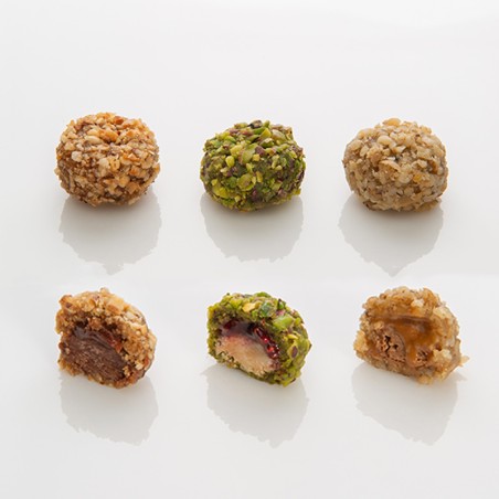 6 x Bouchée Divines : 2 x Pistache et Framboise, 2 x Noix et Caramel beurre salé, 2 x Noisette Chocolat Noir