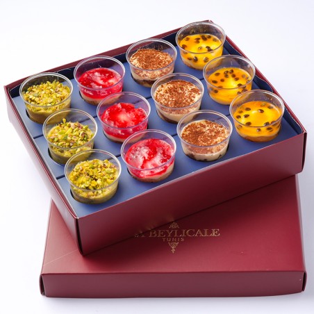 Composition : 12 Verrines Variées : 3 x Tiramisu Gousse de Vanille Café, 3 x Tiramisu Fruits des Bois (Framboise Myrtille), 3 x Tiramisu Pistache, 3 x Tiramisu Mangue Passion